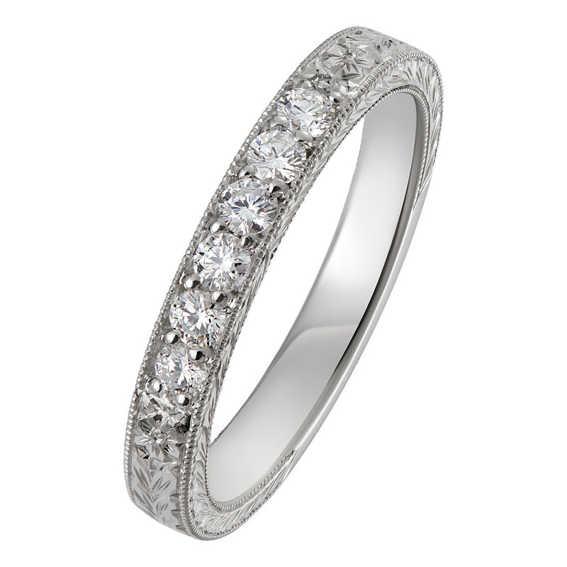 This vintage style diamond floral wedding ring features an expertly hand-engraved forget-me-not flower and leaf pattern on a platinum band. There are six impressive round brilliant-cut diamonds in the centre of the band, with two flowers gracefully completing the design.