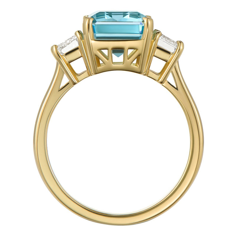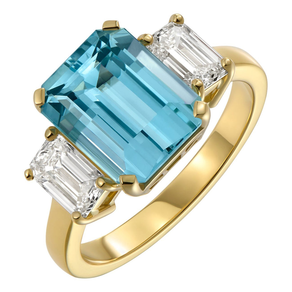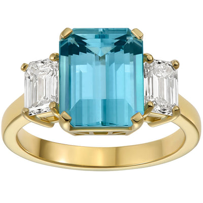 This three stone engagement ring features an impressive emerald cut aquamarine in the centre, flanked by two emerald cut diamonds.