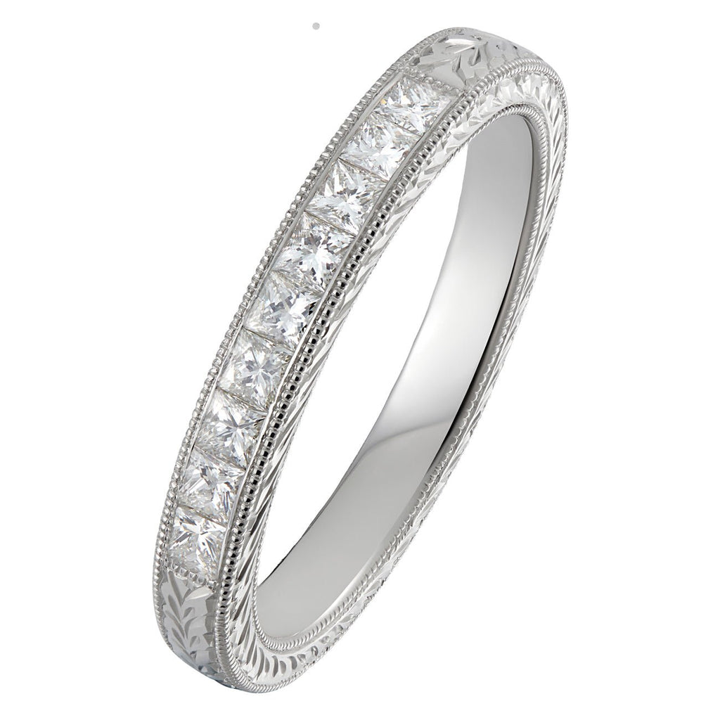 This dazzling 3mm wedding ring for women features nine princess-cut diamonds securely held in a laurel-engraved platinum 950 band. The band features a delicate millegrain edge which further enhances the richness of the vintage style design. Ideal for those seeking an extra touch of elegance for their special day.