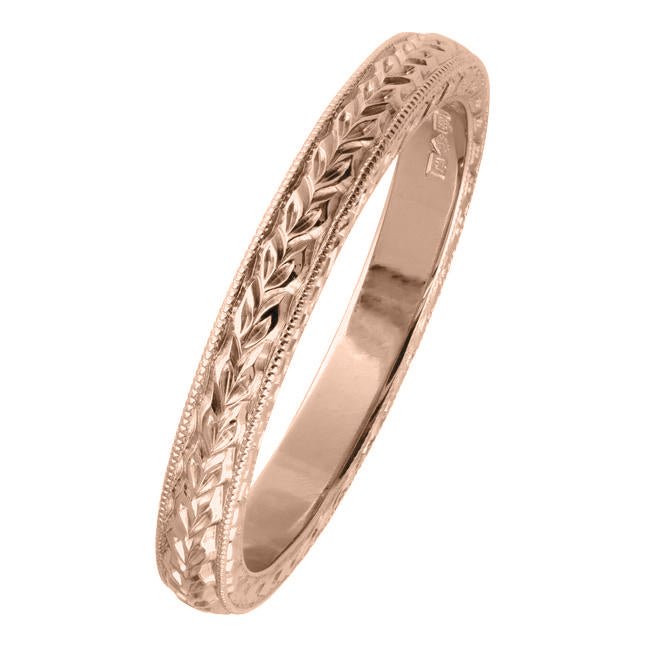 This 18ct rose gold wedding ring is hand engraved with a circle of laurel leaves and edged with millegrain. The 2.20 mm wide court band makes a lovely fit with many vintage style engagement rings.