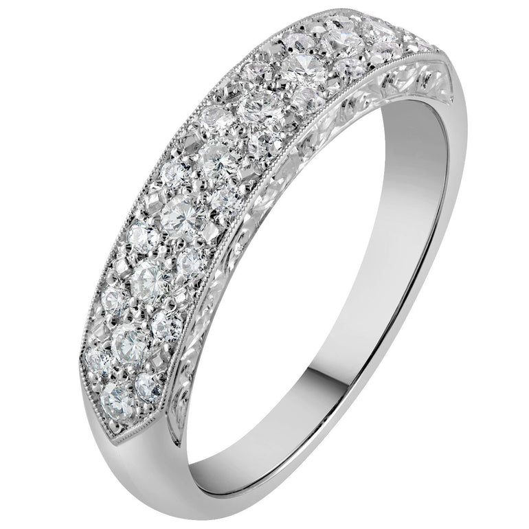 This bespoke wedding ring features a timeless design showcasing Old Cut natural diamonds, beautifully set in luxurious platinum. The band is delicately finished with millegrain edging and intricate fine scroll pattern engraving along the sides, evoking the elegance of vintage craftsmanship while maintaining a refined contemporary silhouette.