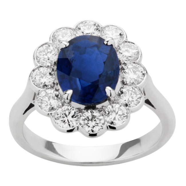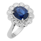 This sapphire cluster ring in platinum features an oval blue sapphire surrounded by round diamonds.