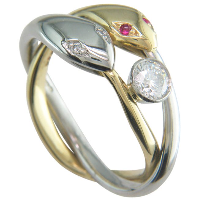 This modern design double snake ring features platinum and gold snakes in a gentle embrace. The cool platinum snake has diamond eyes, while the warmer tone yellow gold snake is set with cabochon ruby eyes. A GIA graded diamond weighing from 0.20 carat to 0.40 carat is held securely in the ring. The symbol of eternity and health, this double snake ring will be set with your choice of diamond.