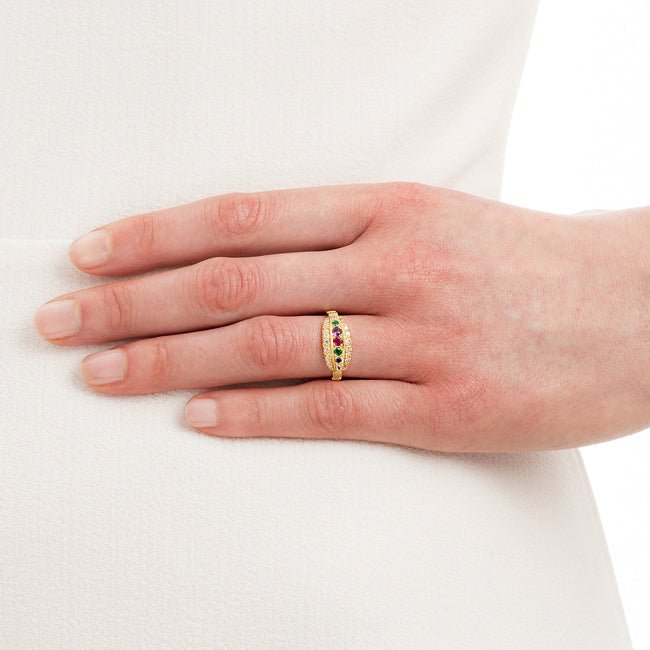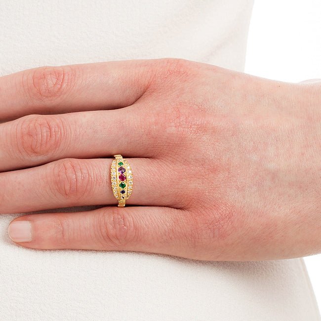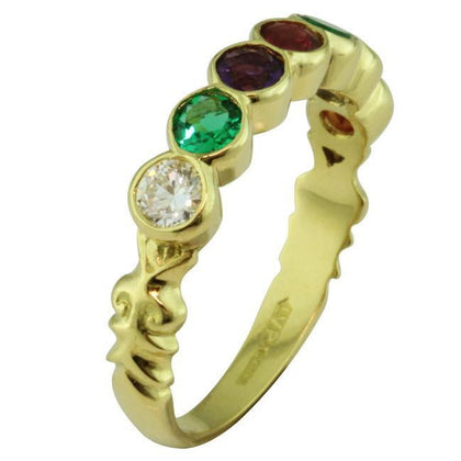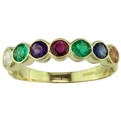 The gemstones for this ring begin with Diamond on the left, followed by Emerald, Amethyst, Ruby, Emerald, Sapphire and Topaz. The gemstones are surrounded by 18 Victorian-cut diamonds.