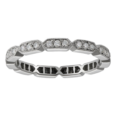 This vintage style diamond full eternity ring or wedding ring features geometric platinum links. Each link is set with three round brilliant cut diamonds. The diamonds are grain set and securely held with small platinum beads.