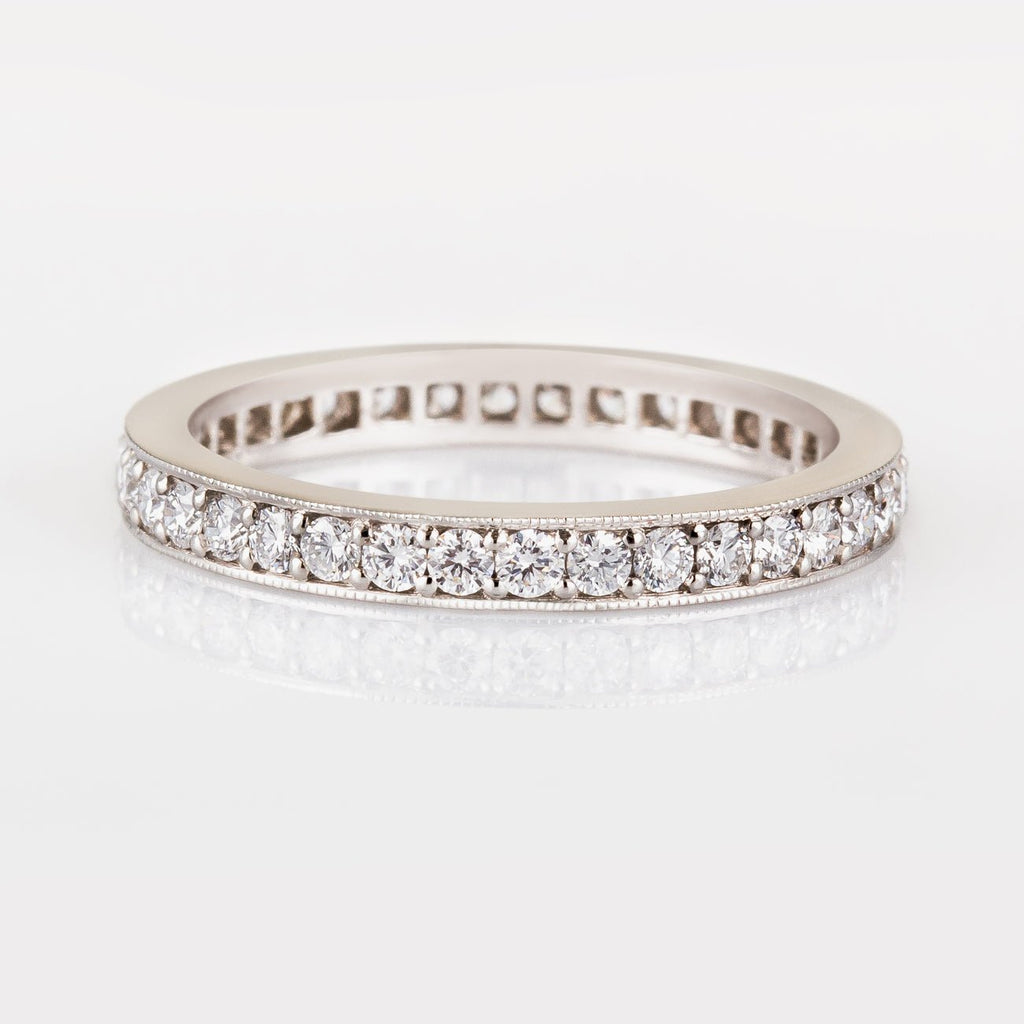 This classic 2.5 mm wide diamond wedding ring complements both vintage style and contemporary engagement rings.