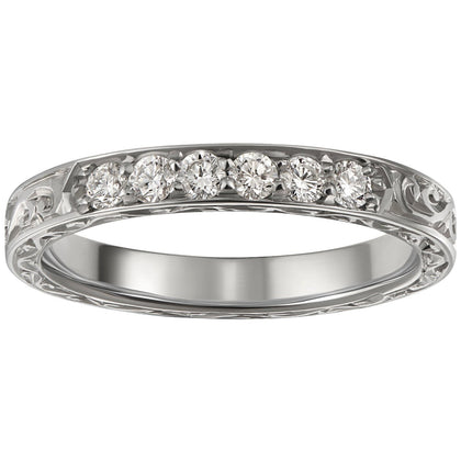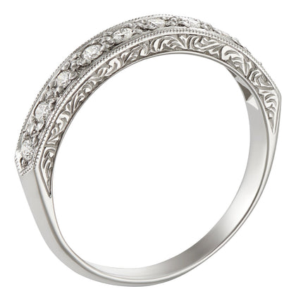 This 3mm vintage-style wedding or half eternity ring is made in 18ct white gold and set with 10 round sparkling diamonds. The fine scroll engraving is made by hand and circles the band. A millegrain (milgrain) edge borders the diamonds. This ring is expertly made in the UK.